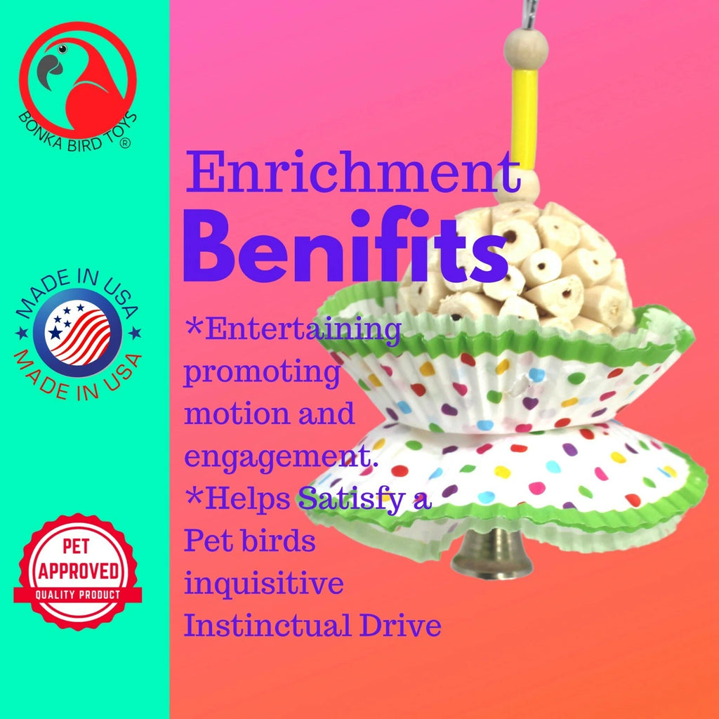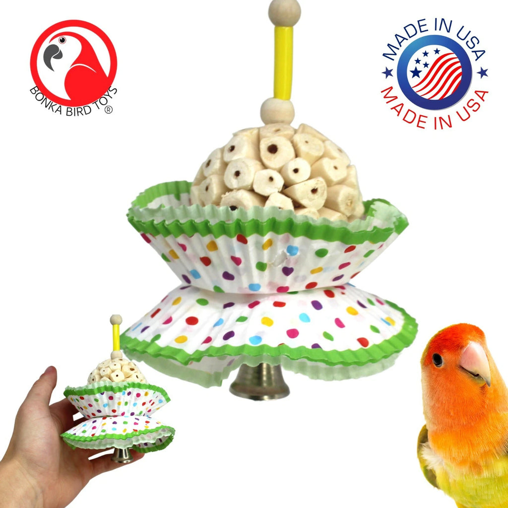 The 1925 Cake from Bonka Bird Toys is a classic shreddable bird toy that's perfect for small and medium-sized pet birds! This tremendous lightweight shreddable delight has an appealing design and looks lovely in any birdcage. The top of this bird toy has a quick link connector to let you get it up in your pets cage quick and easy. A metal wire wraps around the quick link connector and continues through the center of the toy. At the top (2), natural wooden beads and a colorful piece of plastic straw adorn the metal wire. Next your pet will find a ball made of the root of the Sola plant. This is an all natural material thats perfectly safe for pet birds to chew, bite and forage. The sola ball sits inside of a couple of cupcake cups that are very soft and super easy for pets to shred and grab. There are more cupcake cups that are upside down with a piece of shreddy cardboard and a metal bell hanging from the bottom. The 1925 Cake is a great convenient size and is easily able to be placed in most bird cages.