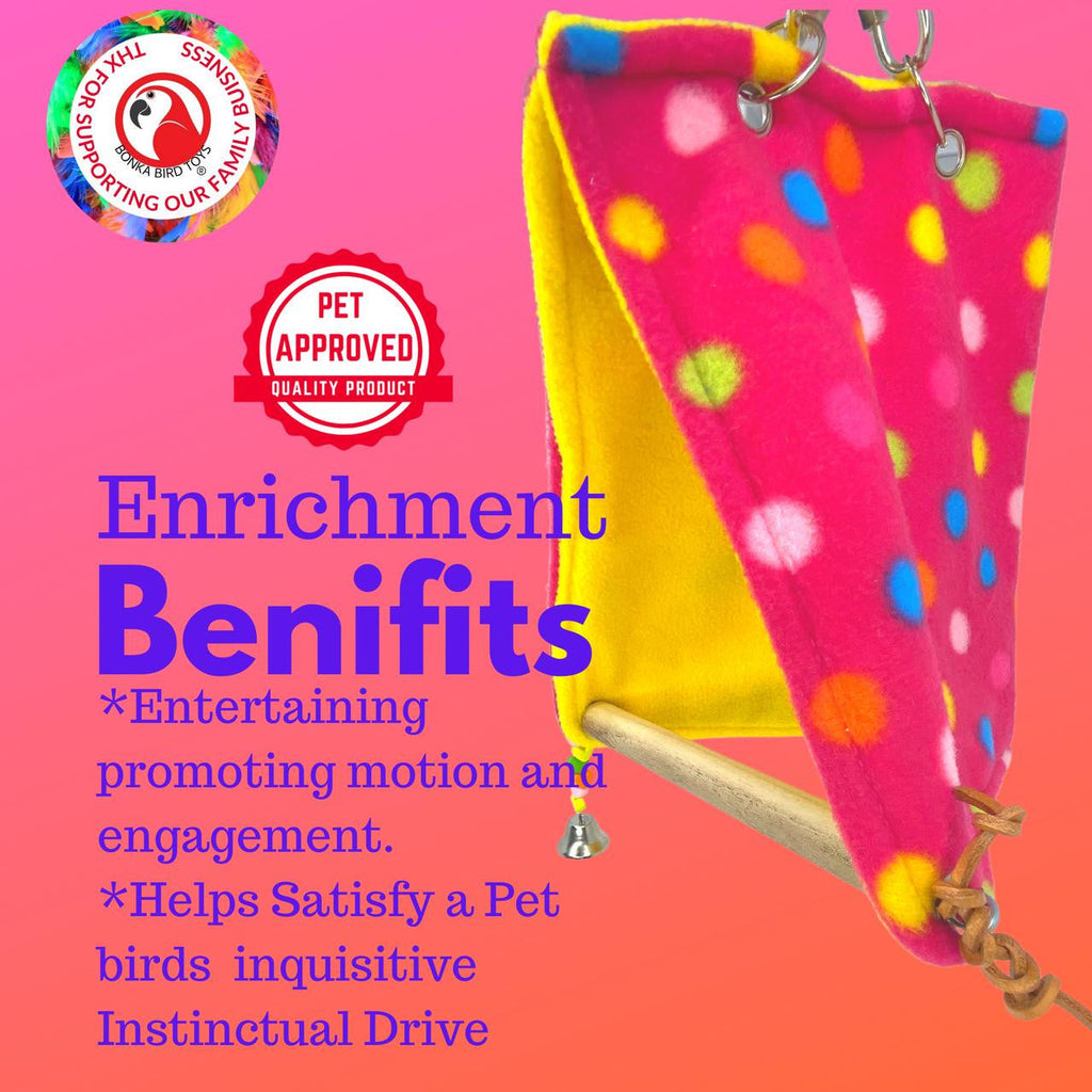 The 2241 Small Hideout Swing from Bonka Bird Toys is a colorful and cuddly hanging swing. The bright, soft fleece tent has a wooden perch at the opening and is decorated with a knotted leather strand, colorful plastic heart beads with a small bell, a cozy swing that will gently rock your best-feathered buddy into a peaceful and happy place. Comes complete with a quick link for easy cage placement, may ship in a different color as to what is shown. The 2241 small hideout swing is 100% bird safe and weighs and measures approximately: Height: (13.75) inches Width: (5.50) inches Depth: (5.50) inches Weight: Under (3) ounces