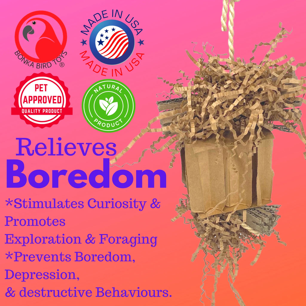 The 3857 Medium Shreddy Eddy from Bonka Bird Toys is a super easy to play with and shreddable bird toy. This medium-sized bird toy is made from easy to rip materials that thrill pets of all ages and abilities. The top of the bird toy includes a quick link connector for fast hanging in the aviary. A natural twine rope loops around the connector and hangs with a sizeable chunky knot. This rope strings down and passes through the center of the toy ending with a long strand on the bottom. On the top and bottom of the bird, toys are bundles of natural shreddy paper that sit on top of rolls of shreddy perforated cardboard. The center body of the bird toy is a large cardboard shred cube that's easy for beaks and feet to rip into. Other than the connector, this toy can be completely shredded apart, providing your pet an excellent foraging experience in their cage.