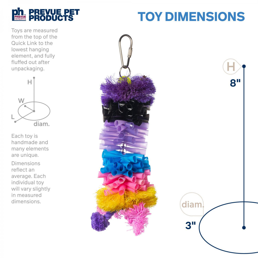Prevue Pet Products Playfuls™ Straw Stacker Bird Toy 62634 is a colorful, dangling toy to shred and pull, satisfying preening instincts and discouraging plucking in your bird. Made from a variety of materials, including cocoa fibers, knotted rope, plastic straws and more. Your small to medium sized bird will love to pull this toy apart and unravel the materials! All components are 100% pet safe and non-toxic with quick-link attachments to connect easily to your bird’s cage. Toy is hand made and actual measurements may vary slightly. As always, supervise birds at play. Our Straw Stacker Bird Toy is approximately 8" Long and 3 1/4'' Wide, ideal for small and medium sized birds.