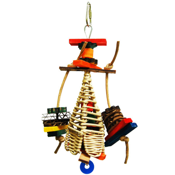 Small toy made of different wicker products, wood parts, and paper rope.