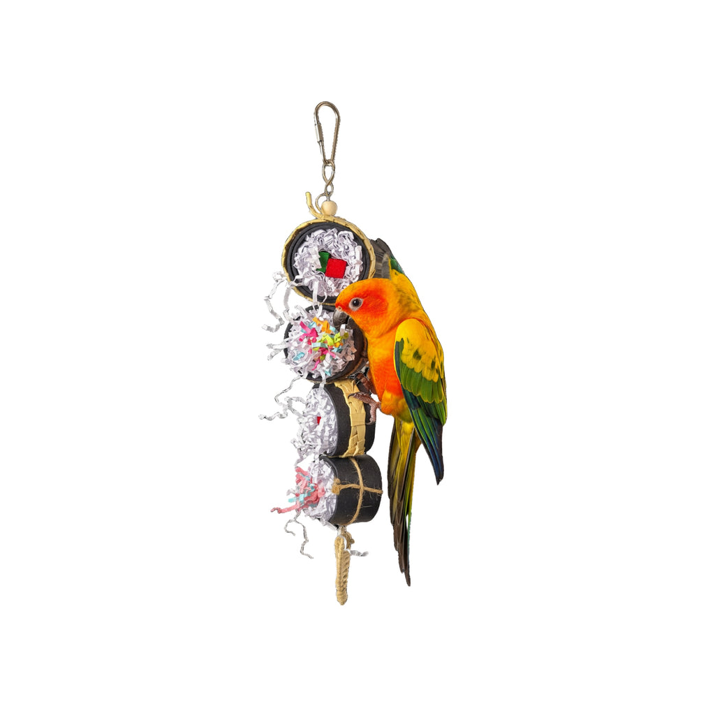 Shredding Toys like the Cali Roll Sushi Stack Hanging Toy can provide an active outlet for energy & help with behavioral issues like aggression and feather plucking