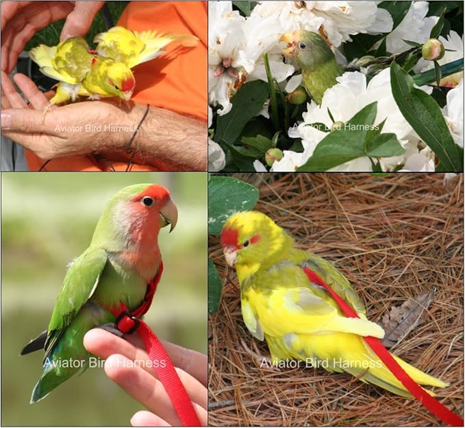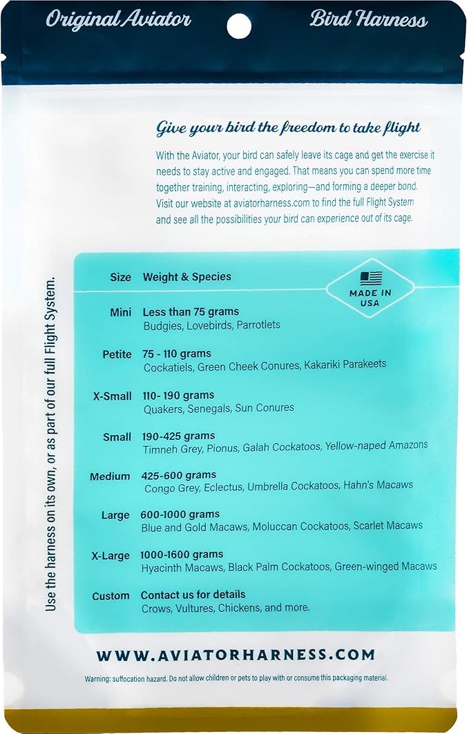 - Mini ( XXXS ) Aviator Harness for birds weighing under 75 grams: Sm. Parakeets, Love Birds, Parrotlets, Plumb Head. We GUARANTEE FIT and will replace for free if you accidentally choose the wrong size.