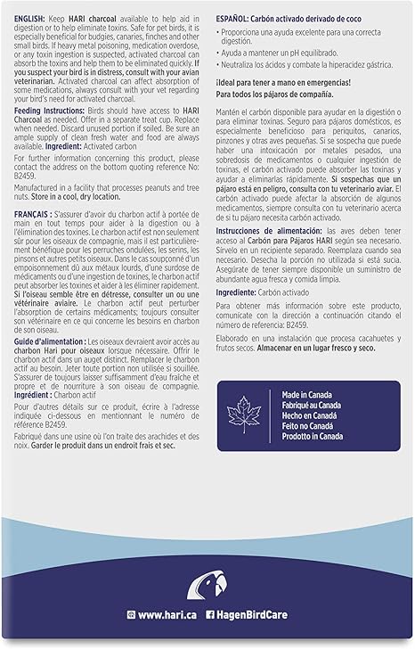 Keep HARI's coconut derived activated charcoal available to help aid in digestion or to help eliminate toxins. Safe for pet birds, it is especially beneficial for budgies, canaries, finches and other small birds. If heavy metal poisoning, medication overdose, or any toxin ingestion is suspected, activated charcoal can absorb the toxins and help them to be eliminated quickly; please consult your Avian Veterinarian if needed.