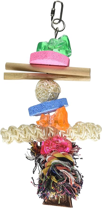 Combo-Kabob is a fun climbing toy for small parrots and medium to large sized birds. Combo Kabob has six different pecking and pulling toys to satisfy all of your birds needs. It also has a copper bell that works as a fun noise maker keeping your pet intrigued. This toy is non-toxic and lead free.