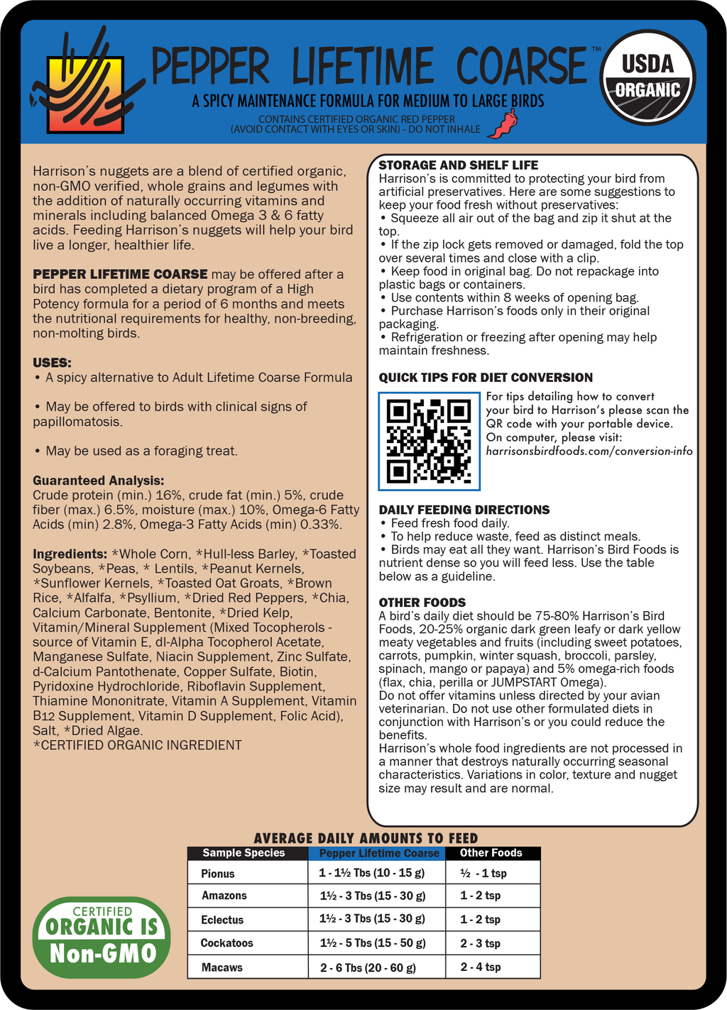 PEPPER LIFETIME COARSE may be offered after a bird has completed a dietary program of a High Potency formula for a period of 6 months and meets the nutritional requirements for healthy, non-breeding, non-molting birds.