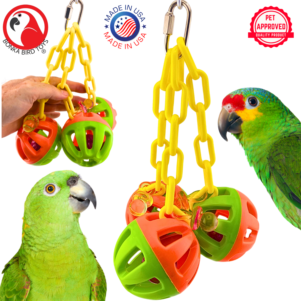 • Constructed with 100% bird-safe plastic materials including 3 durable rattle balls and brightly colored pacifiers suspended from sturdy plastic chains for interactive climbing and pecking.