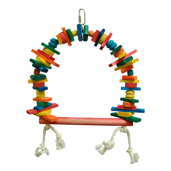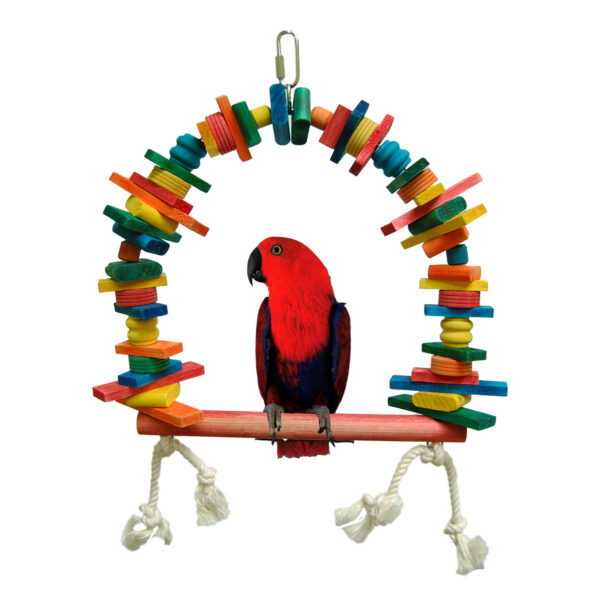 This wood perch is made of different wood pieces, acrylics parts with 100% cotton rope that will keep your bird busy. Dowel size: 3/4″ x 10″.