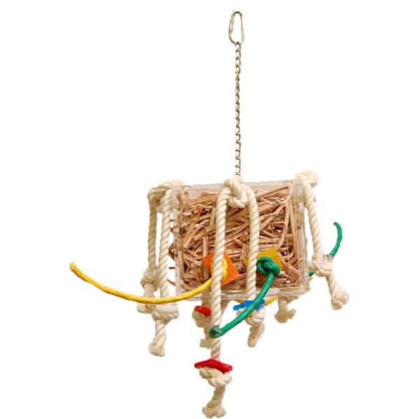 Leather box resistant. Made of acrylic. Fill with vegetable leather pieces. Unknot the rope on the top and refill the box with leather or their special treats. Lots of fun to try to empty it, with holes on box side. Box size: Width: 5″ – Height: 4″. Leather refill please order no 238.