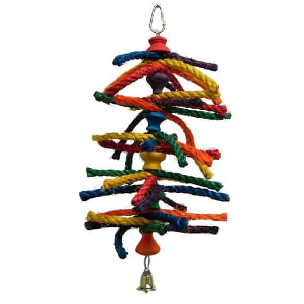Very funny for your parrot and very good price! They can preen a large number of sisal rope, with several wood blocks in between, and a bell at the bottom. With new toys always keep a eye on your bird. This toy is excellent for Parrots that are FEATHER
