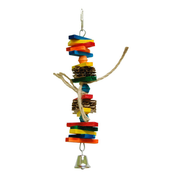 DOLY Dimensions: 8″x2″. Is an interesting toy for birds who like to destroy. Several wooden pieces that they will like to destroy. Excellent for foraging. Made of pine wood and small pieces of cardboard. Natural jute rope.