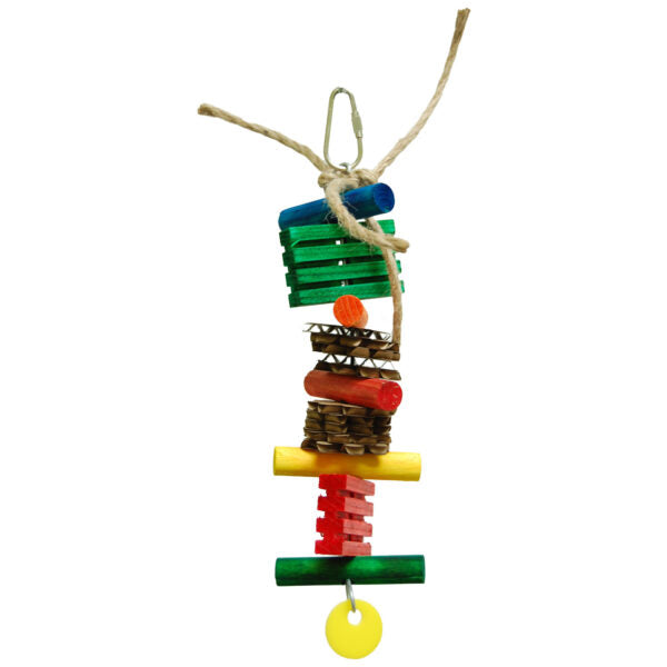 FUNNY Dimensions: 9″ x 2.5″. Is an interesting toy for birds who like to destroy. Several wooden pieces that they will like to destroy. Excellent for foraging. Made of pine wood and small pieces of cardboard. Natural jute rope.