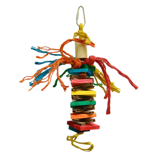 Is an interesting toy for birds who like to destroy. Several wooden pieces that they will like to destroy. Made of pine wood and small pieces of cardboard. Natural jute rope.