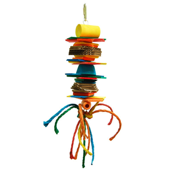 Is an Interesting toy for birds who like to destroy. Several wooden pieces that they will like to destroy. Excellent for feather picker. Made of pine wood and small pieces of cardboard. Natural jute rope.