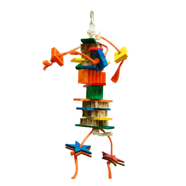 Dynamite bird toy is made of natural paper rope, cotton rope, with several wood parts. Many different shapes including shredded cardboard and groovy wood blocks.