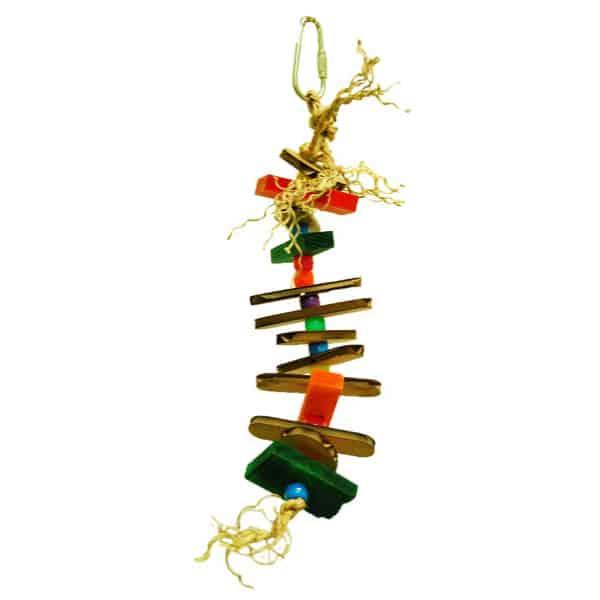 Made of slices of cardboard and slices of pine wood with seagrass rope. Fun to shred.