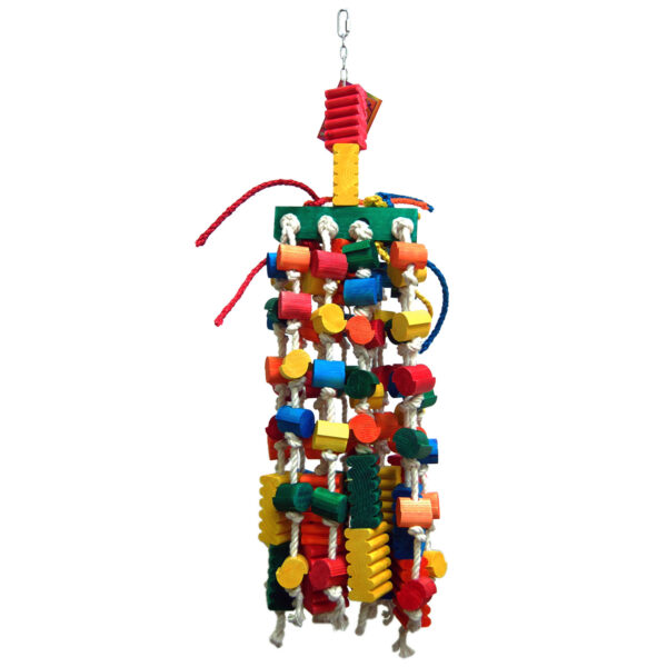 Creative Toy: Provide healthy creative stimulation. Wood toy with a lots of wood pieces, with 100% cotton rope, sisal rope. Nontoxic dye. Hang from welded smooth chain. This toy is excellent for Parrots that are FEATHER PICKER.