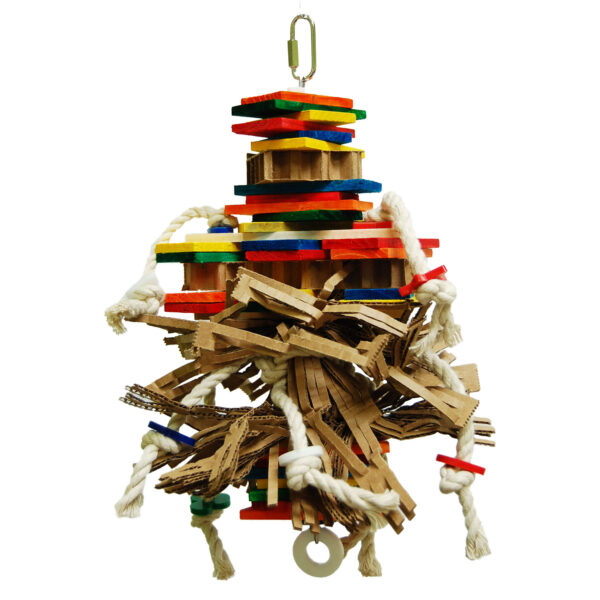 Is an interesting toy for birds who like to destroy. Several wooden pieces that they will like to destroy. Excellent for foraging. Made of pine wood and small pieces of cardboard. Natural cotton rope.